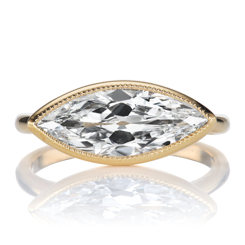 The Malbec 1.88 ring is an AB original design made right here in NYC. The ring centers a GIA-certified 1.88 carat Marquise Cut diamond of E color, SI2 clarity. The stone is bezel set in our signature 18kt Yellow Gold with fine millegrain detail around the stone. The ring is currently size 6 and can be resized!