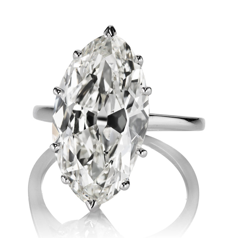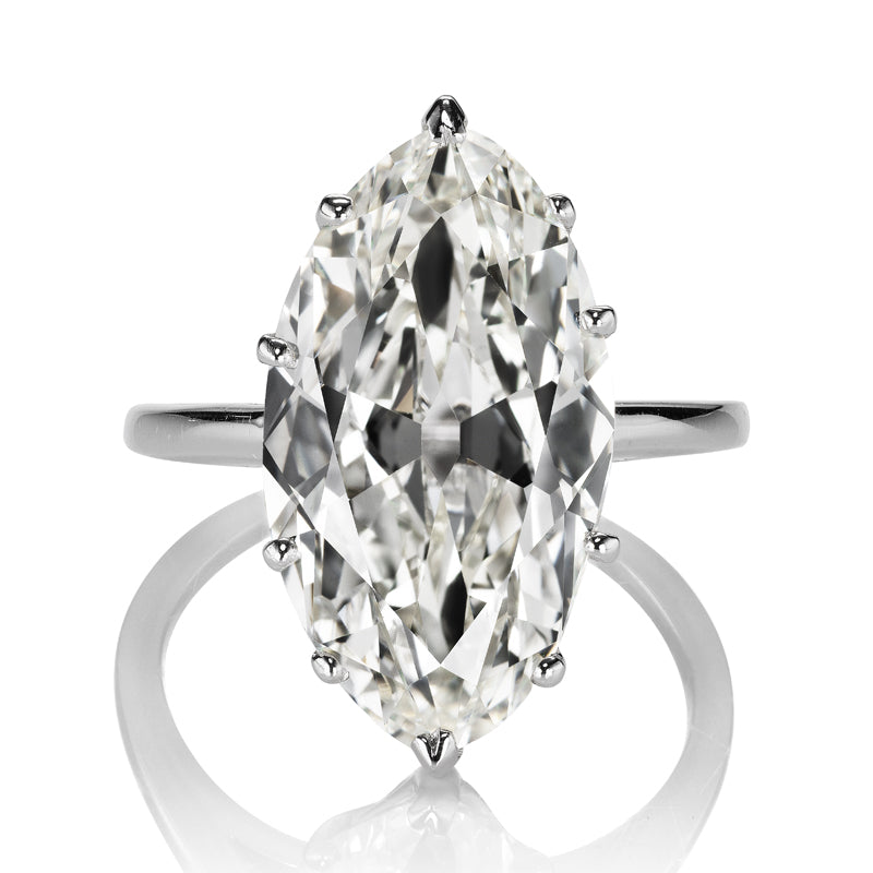 The Orin ring is an Estate ring centering a gorgeous antique diamond. The ring centers a GIA Certified 9.15 carat Marquise Cut diamond of K color, VS2 clarity. The stone is set in a delicate Platinum prong setting. The ring is currently size 6.5 and can be resized!