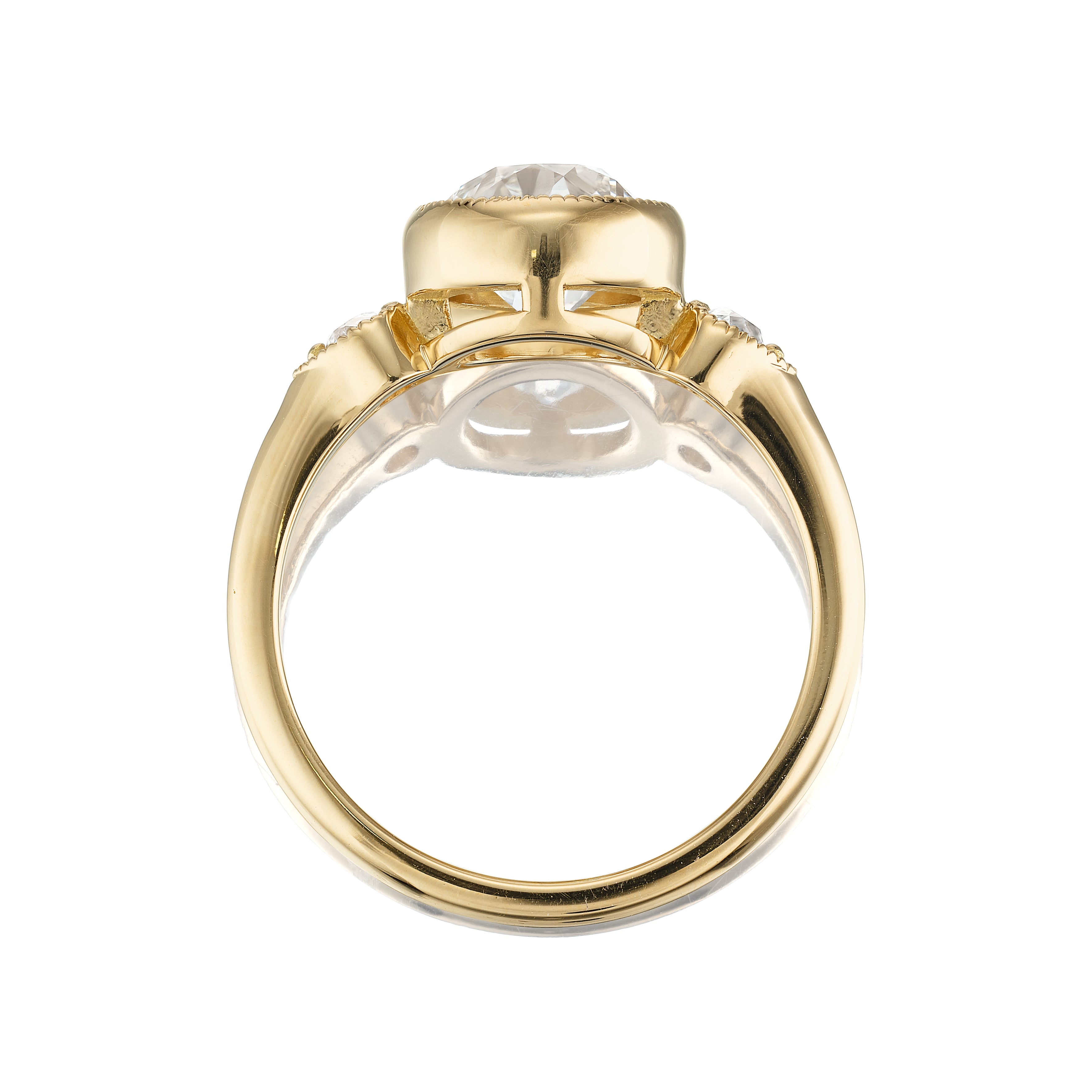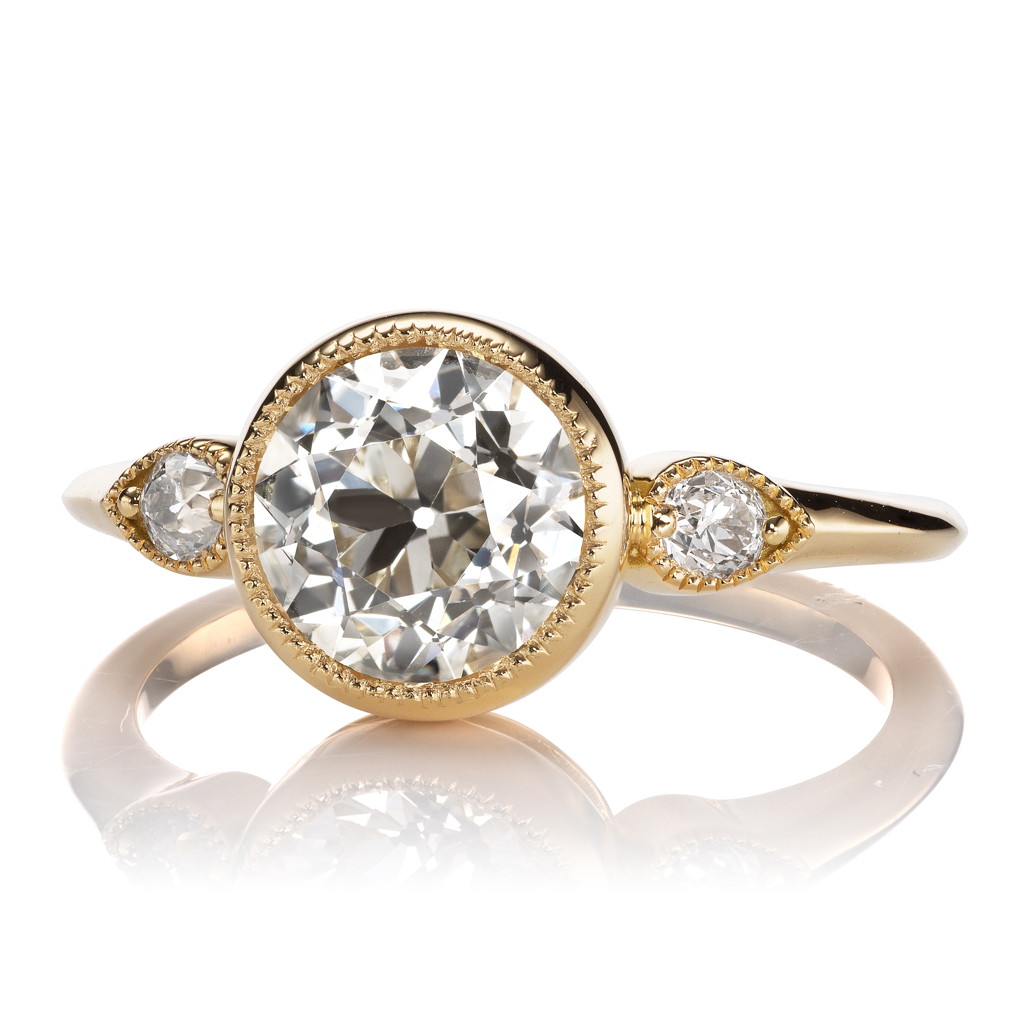 The Cerise 1.69 ring is an AB original design made right here in NYC. The ring centers a GIA-certified 1.69-carat Old European Cut diamond of M color, SI1 clarity. On each side of the center stone is a small Old European Cut diamond set in pear shaped shoulder. The stones are set in an 18k gold setting. The ring is currently size 5.75 and can be resized!