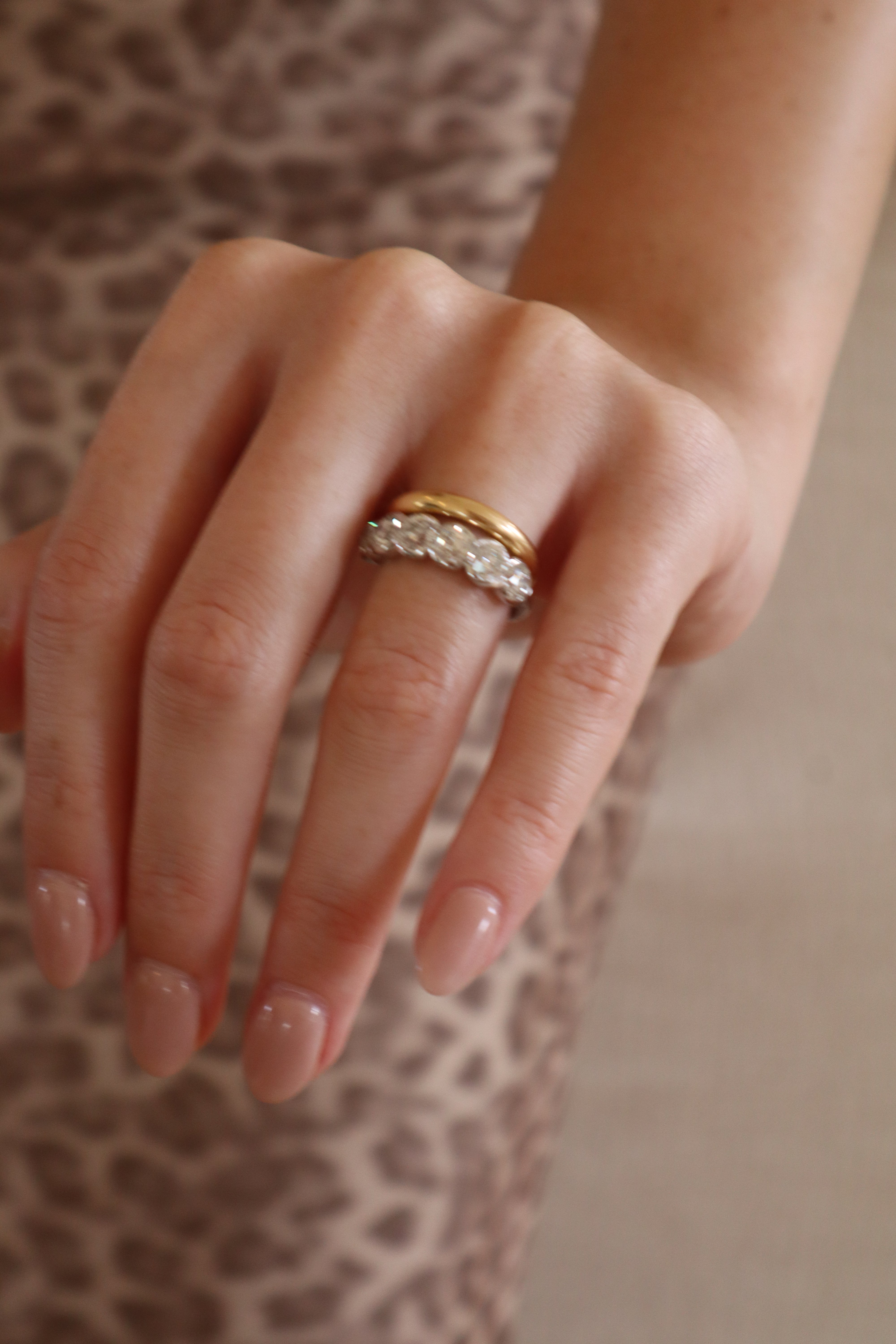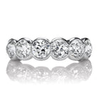 The Allure 2.55 band is an AB original design made right here in NYC! This ring features 6 Old European Cut diamonds that combine for 2.55 carats and are half bezel-set in platinum. The diamonds are approximately H-I in color, VS-SI in clarity. The ring is currently size 5.75 and can be resized!