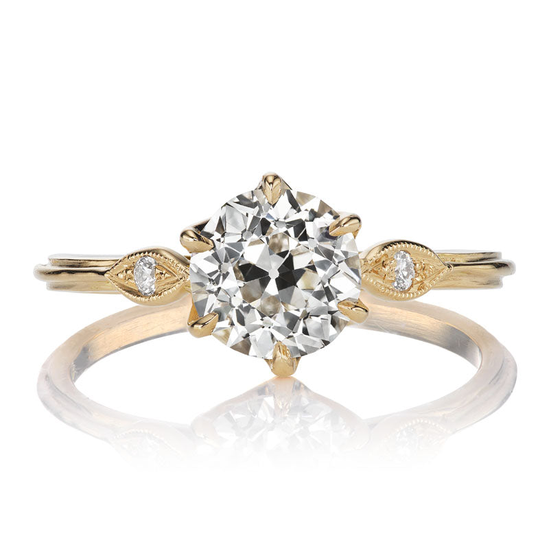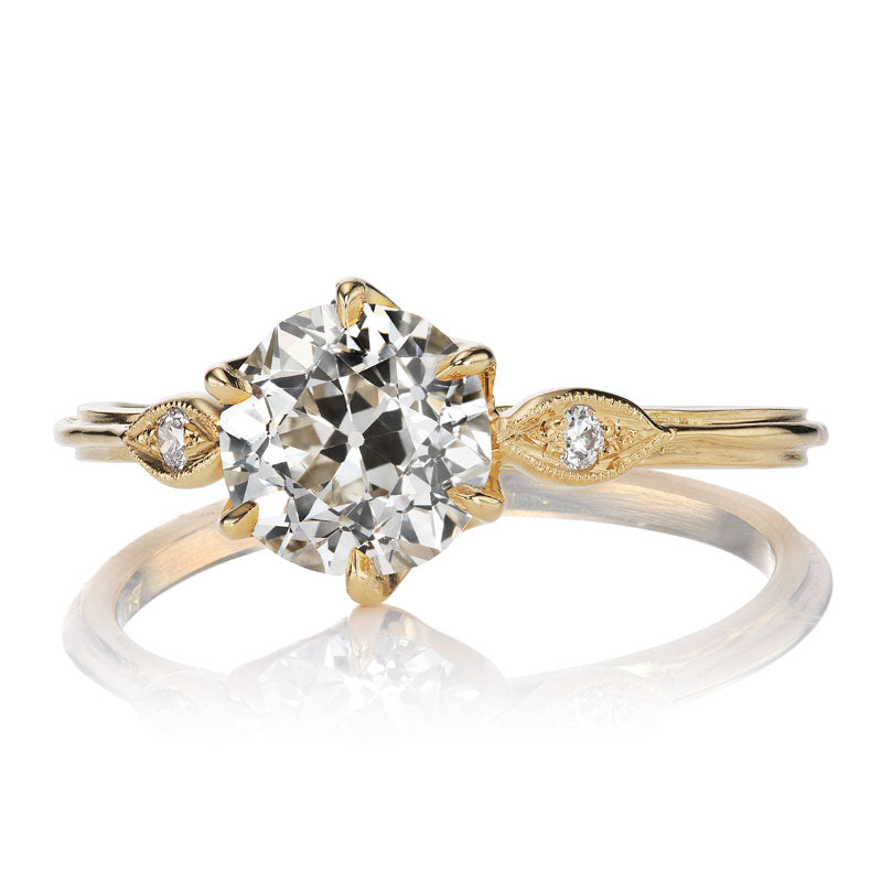 Alva is a favorite design for its feminine leaf-like shoulders, fine millegrain detail, and elegant fluted band. Centering a nearly 1.5 carat glittering antique diamond, Alva combines the features of a classic solitaire with sweet details and side stones.