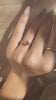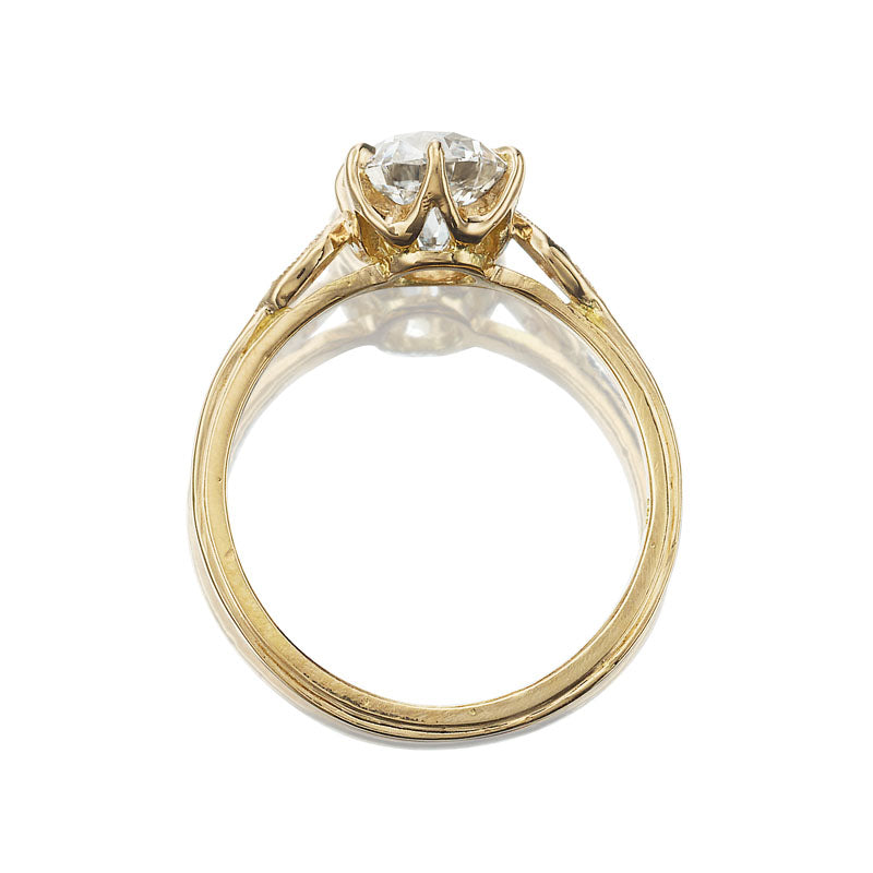 The Alva 1.36 ring is an AB original design. The ring centers a GIA-certified 1.36-carat Transitional Cut (it looks more like a classic OEC to us) diamond of L Faint Brown color, VS2 clarity. The stone is set in a 6-prong 18kt yellow gold setting with leaf-like shoulders. The ring is currently size 5.75 and can be resized!
