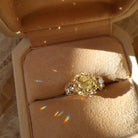 One of our all-time favorite diamonds. This piece features a breathtaking stone with bold, chunky faceting that creates a stunning contrast of light and dark within this sunny diamond. The two bright white side stones highlight the buttery hue that we are always looking for. Set in our classic Marielle setting that creates an elegant finger-spanning look while maintaining a low profile on the hand.