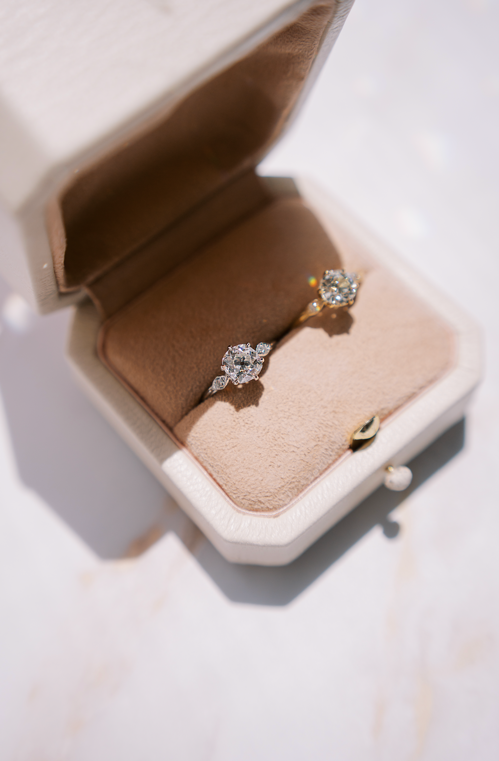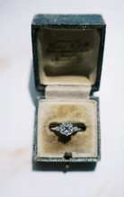 A beloved style based on a French antique we once had, this rendition centers a beautiful antique diamond in a bright white color with the dream antique faceting.