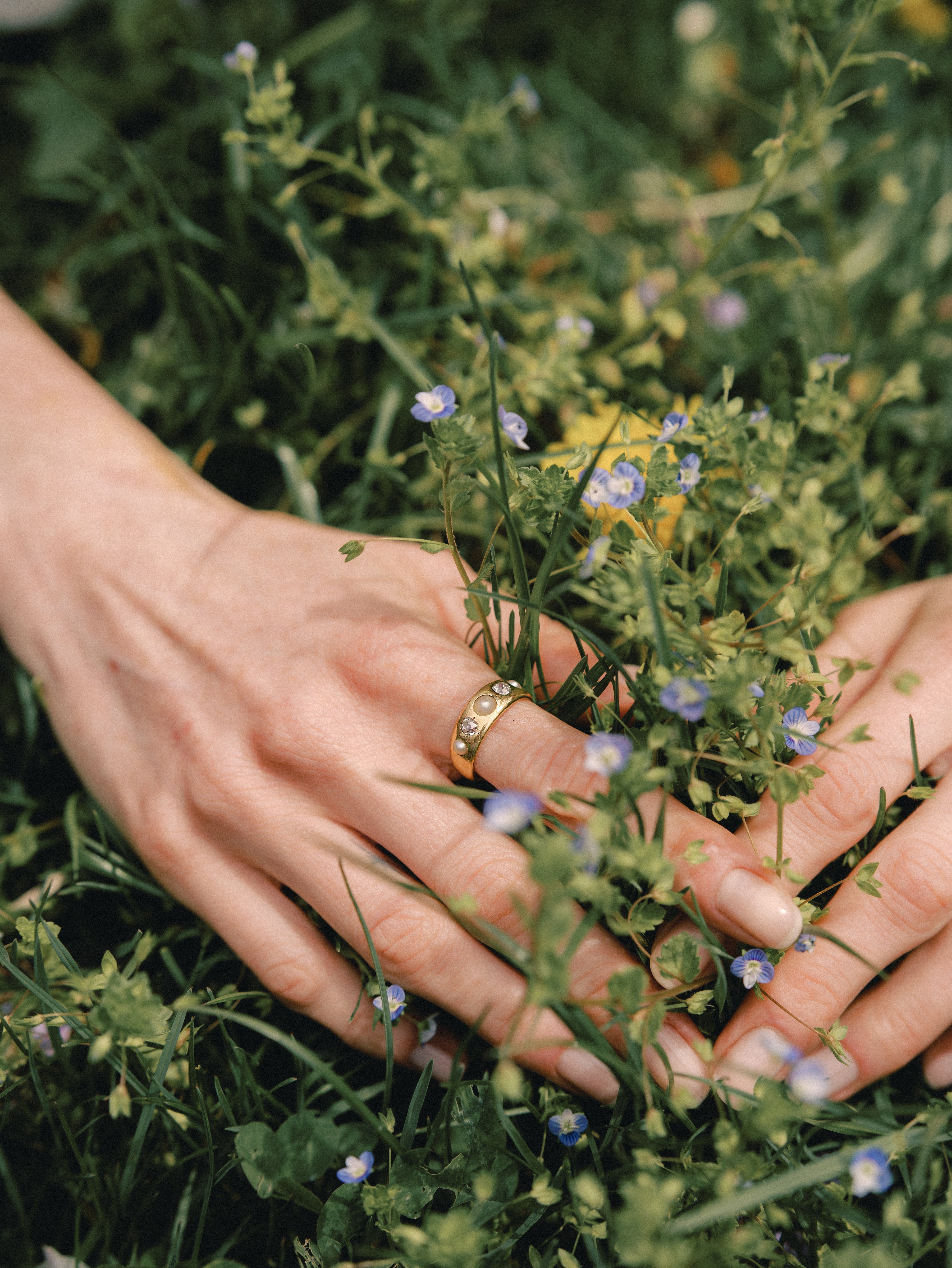 Pearls, diamonds, and gold - three of our favorite things, all wrapped up into one lovely gypsy ring. We adore a piece like this on the pointer finger for an added dose of cool.