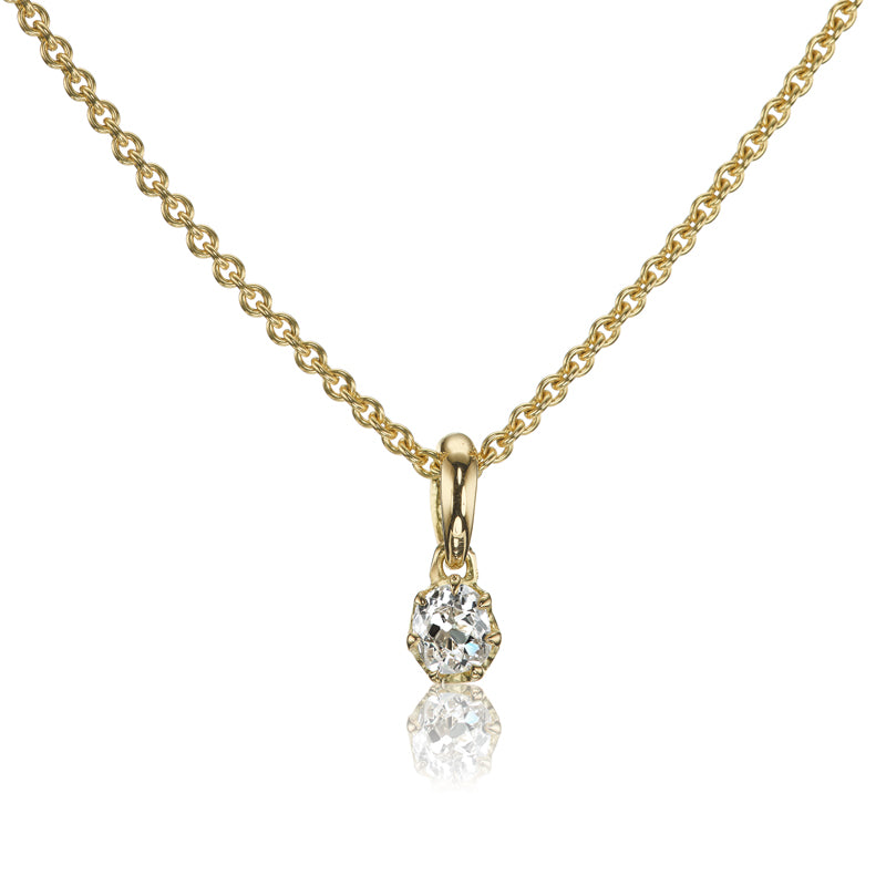 The Brigette Necklace 0.48 is an AB original design made here in NYC. The necklace features a 0.48-carat Old Mine Cut diamond of L color, VS2 clarity. The diamond is prong-set in a pendant of our signature 18kt yellow gold and comes with an 18-inch 18kt yellow gold chain.