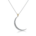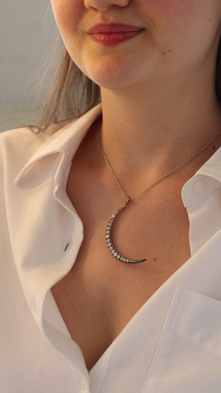 The Selene pendant is an authentic antique diamond pendant from the Victorian era. The crescent-shaped pendant features 28 Old Cut diamonds in graduating sizes of approximately 2.20 carats of H-I color, VS-SI clarity. The diamonds are bead set in a two-tone 18kt yellow gold and silver setting. We added an 18kt yellow gold bail to the piece and paired it with a delicate platinum chain.