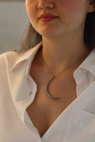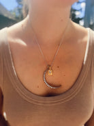 One of our favorite conversion pieces to date, the Selene necklace is an eye-catching piece that lies beautifully around the neck! Victorians were big fans of all things lunar and interested in the moon's connections to Ancient Greek goddesses and this necklace is certainly fit for a modern goddess. Its bright diamonds glitter in patina, and we attached a gold shell-shaped bale to amplify the ethereal element of this Victorian piece. The sliding bale allows the addition of other pendants like our Lulu Pendant, to create a unique stack of charms.