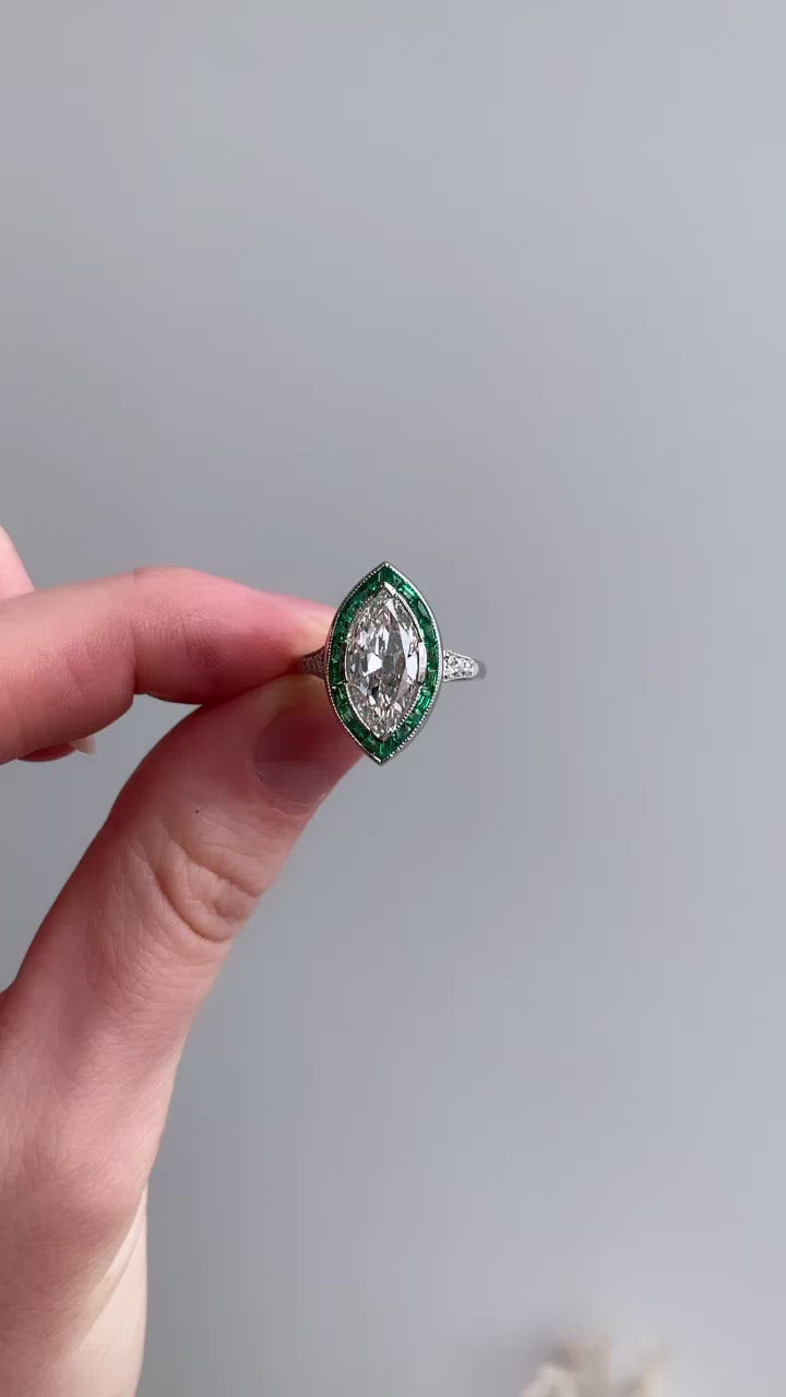The Gretchen 2.19 ring is an AB original design made right here in NYC. The ring centers a GIA-certified 2.19-carat Marquise cut diamond of G color, SI1 clarity. The stone is set in a platinum setting. Twenty carré cut emeralds are channel-set into a platinum halo surrounding the center stone with 3 old European cut diamonds set into each tapering shoulder. The ring is currently size 5.75 and can be resized!