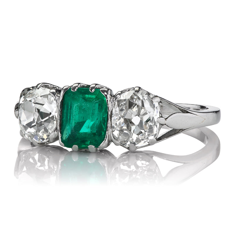 The Quinn ring is an authentic vintage diamond ring from the Edwardian Era circa 1910. The ring centers a GIA-certified approximately 0.35-carat Colombian Emerald of no clarity enhancement. On either side of the center stone is an Old Mine Cut diamond of approximately G-H color, totaling approximately 0.60 carats. The stones are set in a platinum setting. The ring is currently size 6.25 and can be resized!