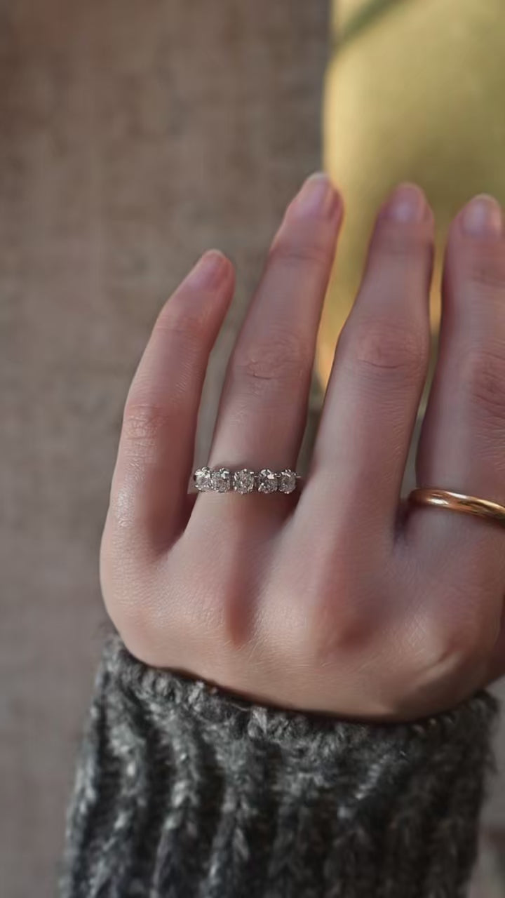 The Andria Band 1.04 is an AB original design made right here in NYC. The ring centers 5 Old Mine Cut diamonds totaling 1.04 carats of I-J color, VS-SI clarity. The stones are set in a platinum setting. The ring is currently size 6.5 and can be resized!