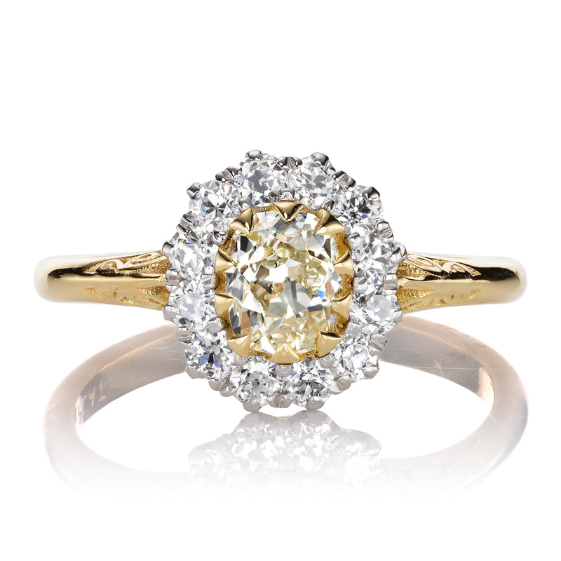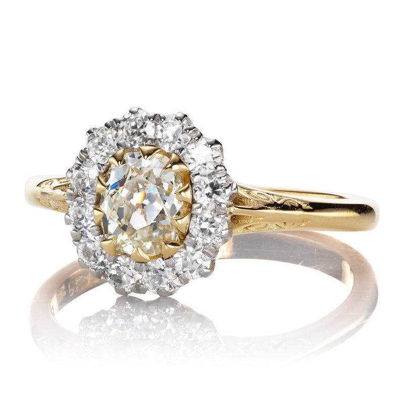 The Riley 0.58 ring is an AB original design. The ring centers a GIA-certified 0.58 carat Old Mine Cut diamond of Very Light Yellow Green color, SI1 clarity. Surrounding the center stone is a halo of Old European Cut diamonds of approximately H-I color, VS clarity. The stones are set in a two-tone 18kt Yellow Gold and Platinum setting with engraved details on the band. The ring is currently a size 5.75 and can be resized!