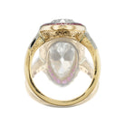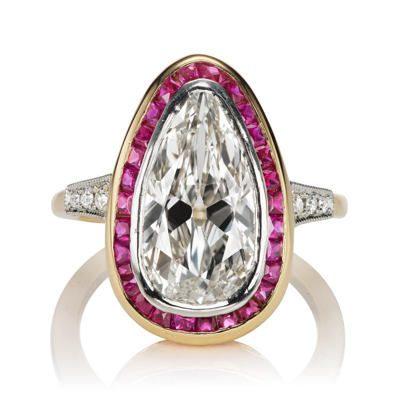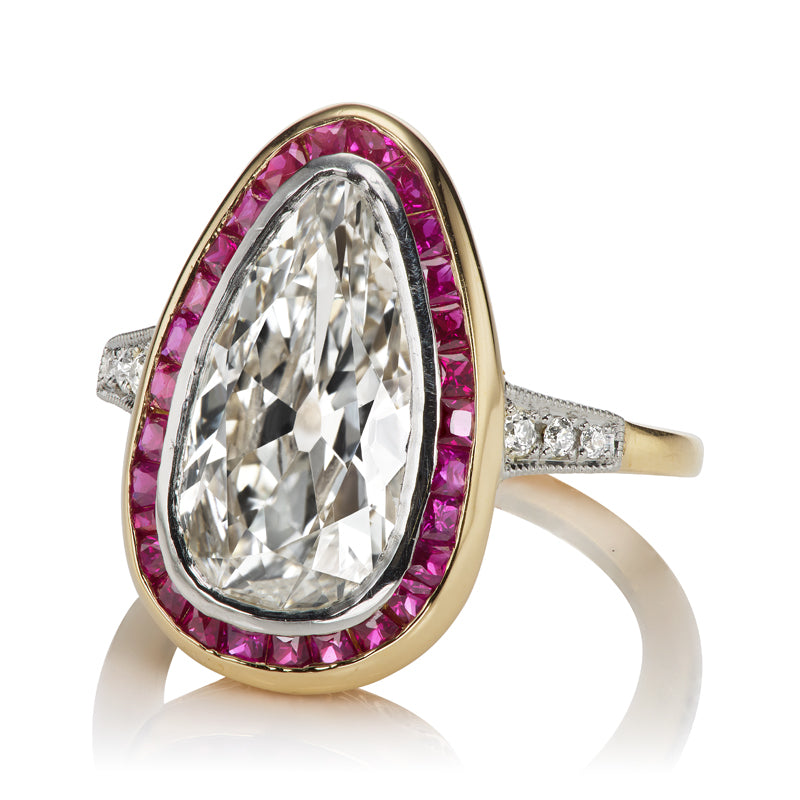 A dreamy, bright antique pear diamond takes center stage in this antique-inspired piece. The rubies add a vibrant contrast to this glittering stone, creating a bold and beautiful statement piece. Delicate details like hand-engravings and milgrain highlights finish off this labor of love.