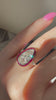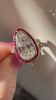 The Cordis 3.32 ring is an AB original design made right here in NYC. The ring centers a GIA-certified 3.32-carat old Pear Cut diamond of H color, SI1 clarity. The stone is bezel-set in a platinum and 18kt yellow gold setting with a halo of Calibré cut rubies. The ring is currently size 5.5 and can be resized!