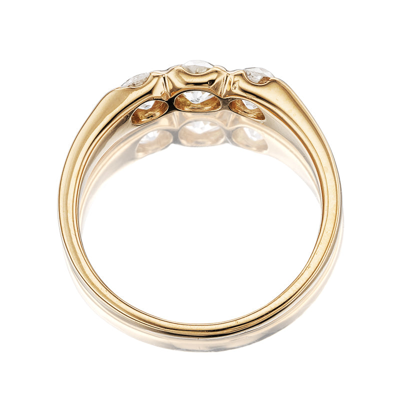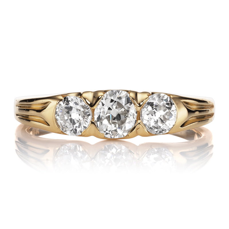 The Aubrey 0.97 ring is an AB original design. The ring features three Old Mine Cut diamonds of approximately J-K color, VS-SI clarity, combining for 0.97 carats. The stones are set in an 18kt yellow gold setting with white plating between the stones. The ring is currently size 6.5 and can be resized!