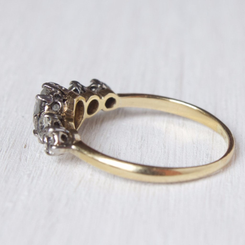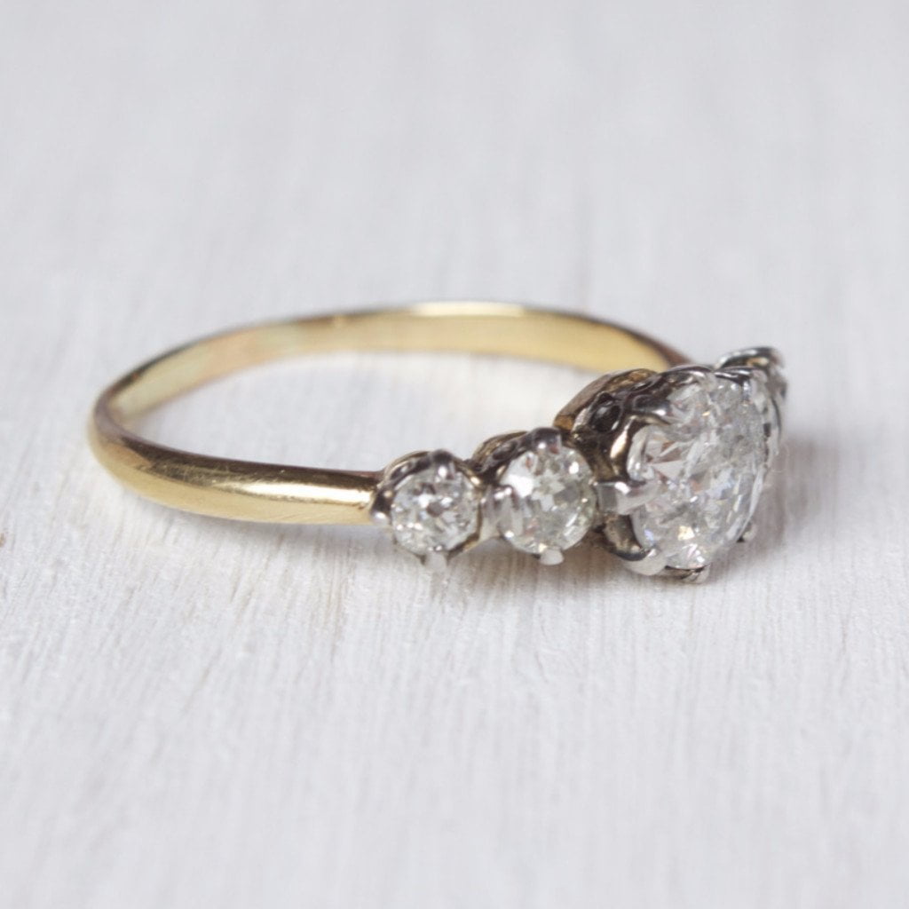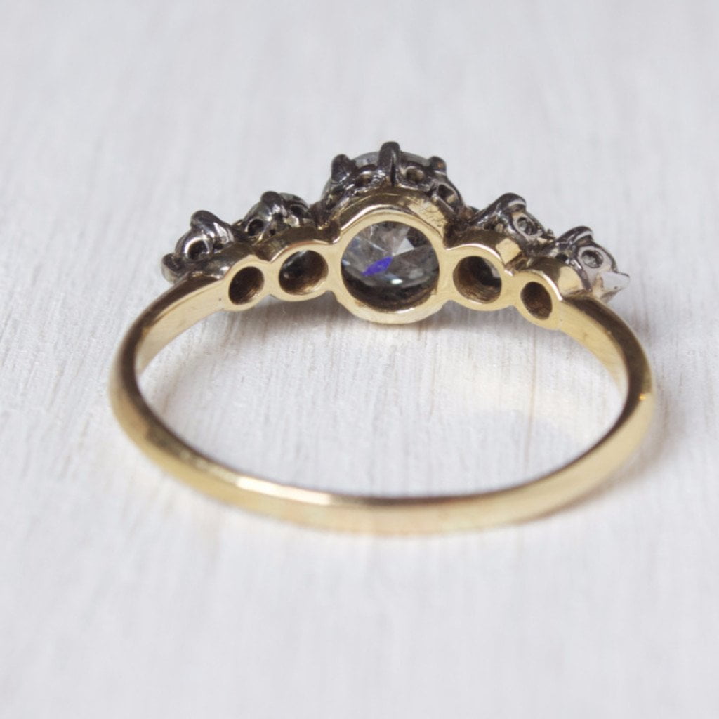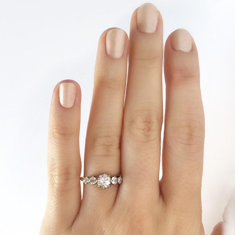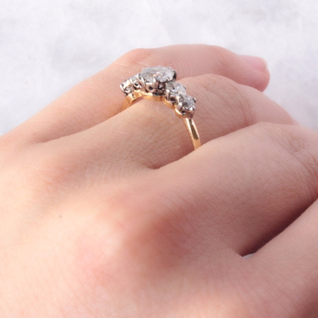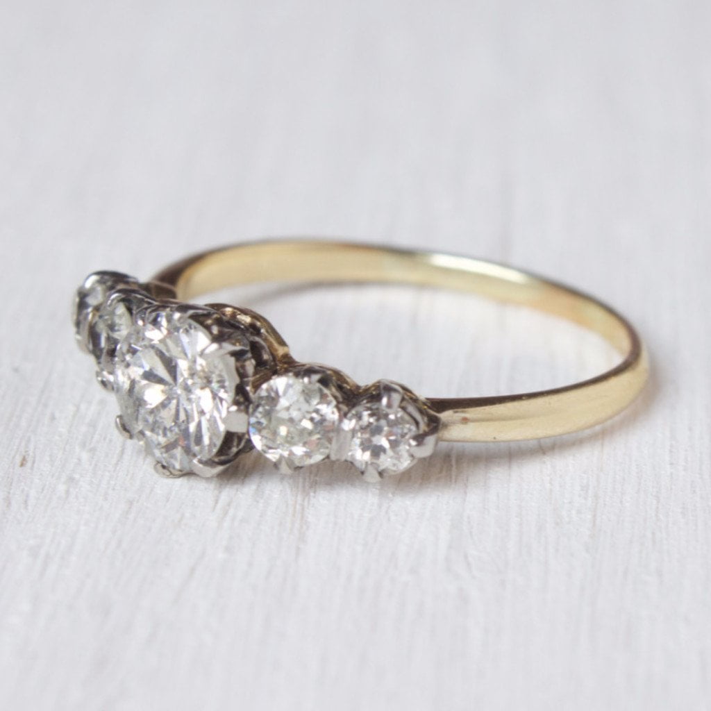 Arielle is a lovely mid-century 5 stone diamond engagement ring set in yellow gold. The center stone is a 0.85 Round Brilliant cut diamond graded J color I1 clarity. The center stone is set in eight prongs and has two stones on each side that taper in size. Total weight of the side stones is approximately 0.50 carats. Currently a size 7.75 and can be resized to most sizes.