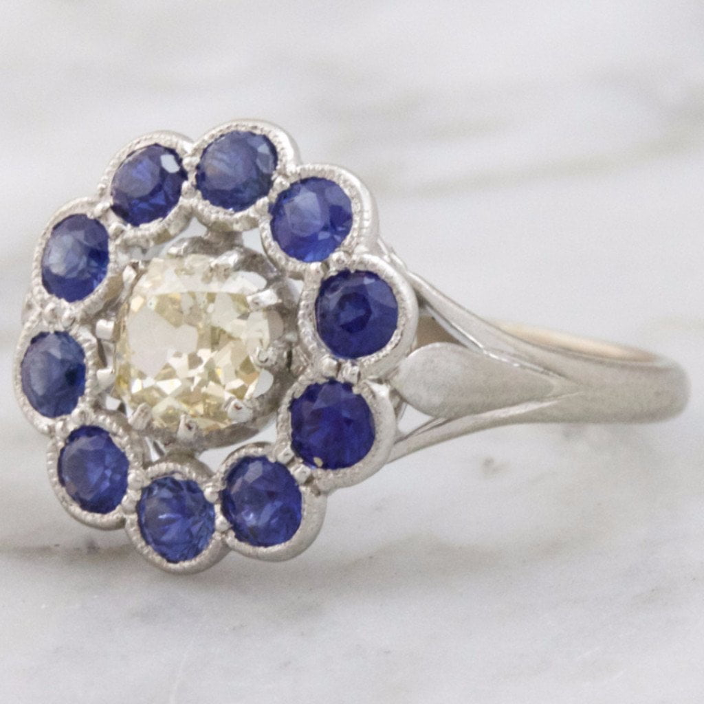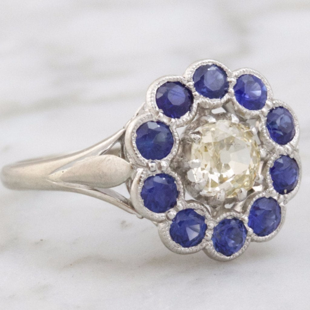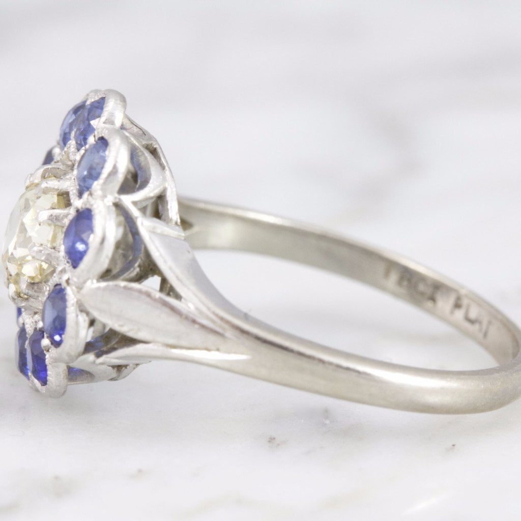 The Grace ring is great because of the splash of color that the vibrant blue sapphires add to the white metal and diamond.. The center stone surrounded by the sapphires evokes the look of a flower and its petals. Add to this the Fleur-de-Lys platinum sides and you have a very unique Edwardian piece!
