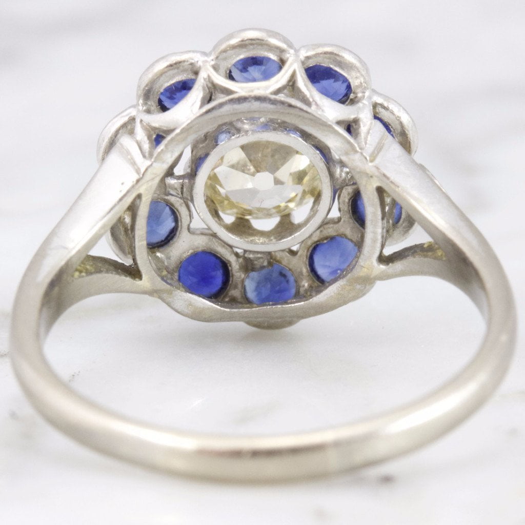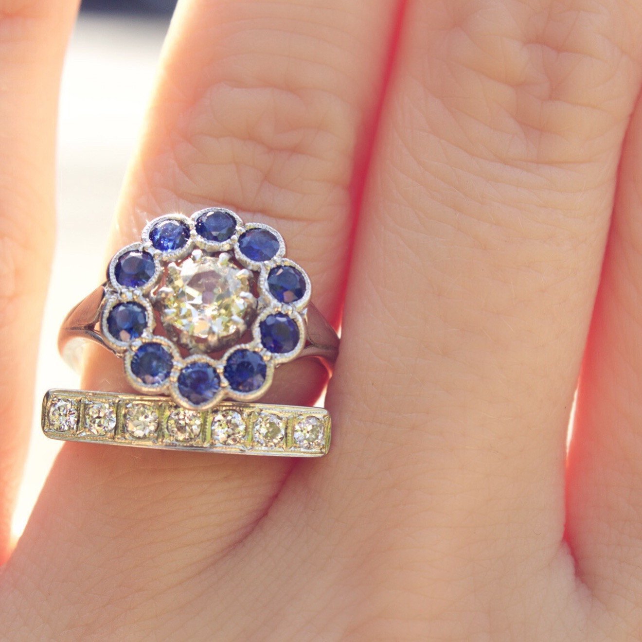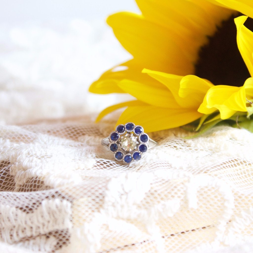 The Grace ring is great because of the splash of color that the vibrant blue sapphires add to the white metal and diamond.. The center stone surrounded by the sapphires evokes the look of a flower and its petals. Add to this the Fleur-de-Lys platinum sides and you have a very unique Edwardian piece!