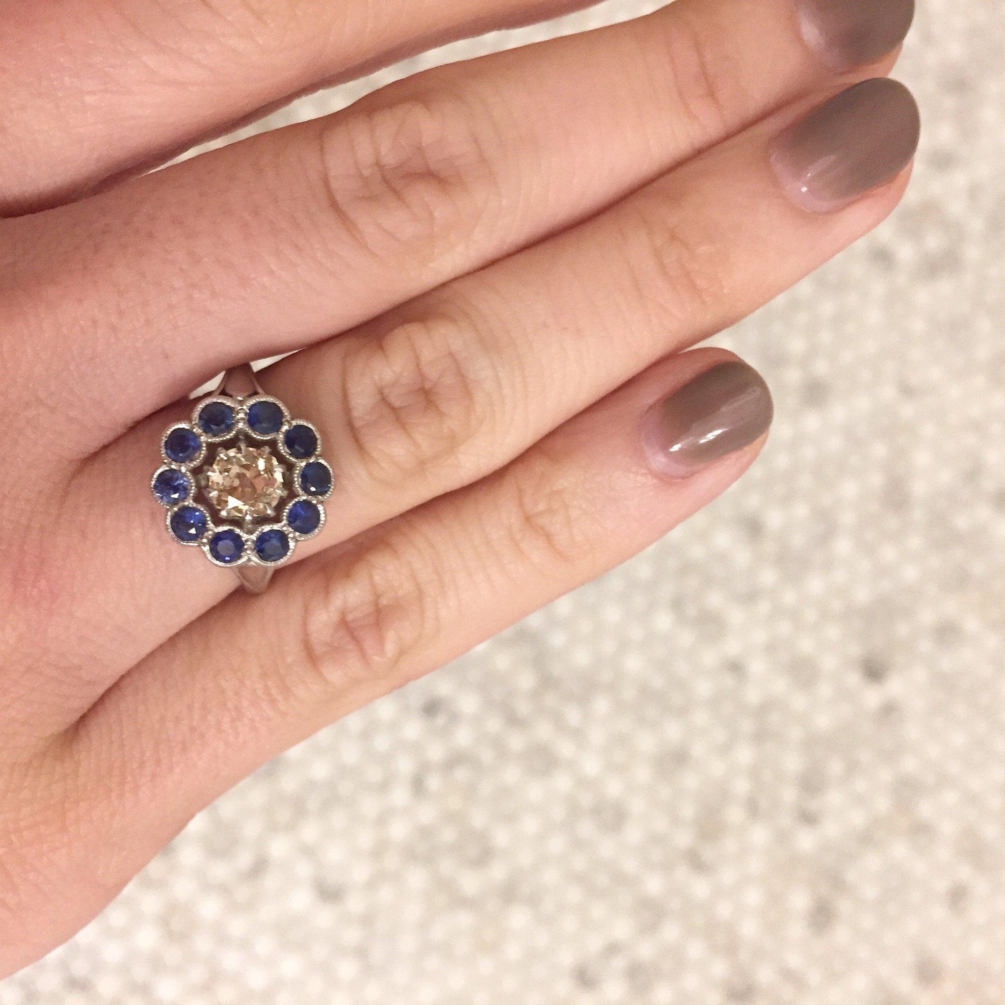 The Grace ring is a vintage Edwardian engagement ring centering a 0.59 carat old mine cut diamond of L-M color, SI2 clarity. The center diamond is surrounded by a halo of 10 round bezel set sapphires in a platinum mounting. The bezels are adorned with beautiful millegrain. The platinum band flairs out into Fleur-de-Lys inspired shoulders. Currently a size 7.5 and can be sized to fit.
