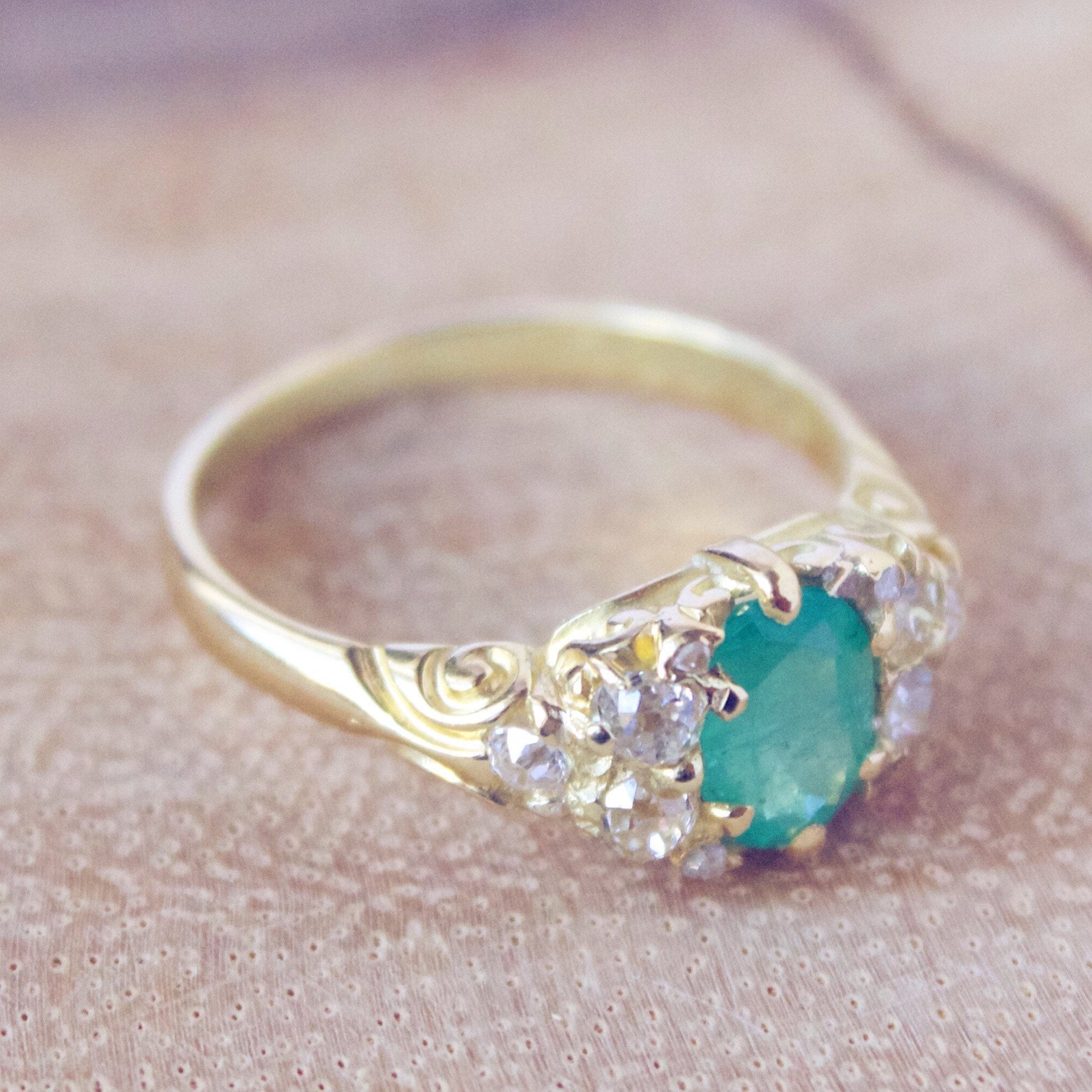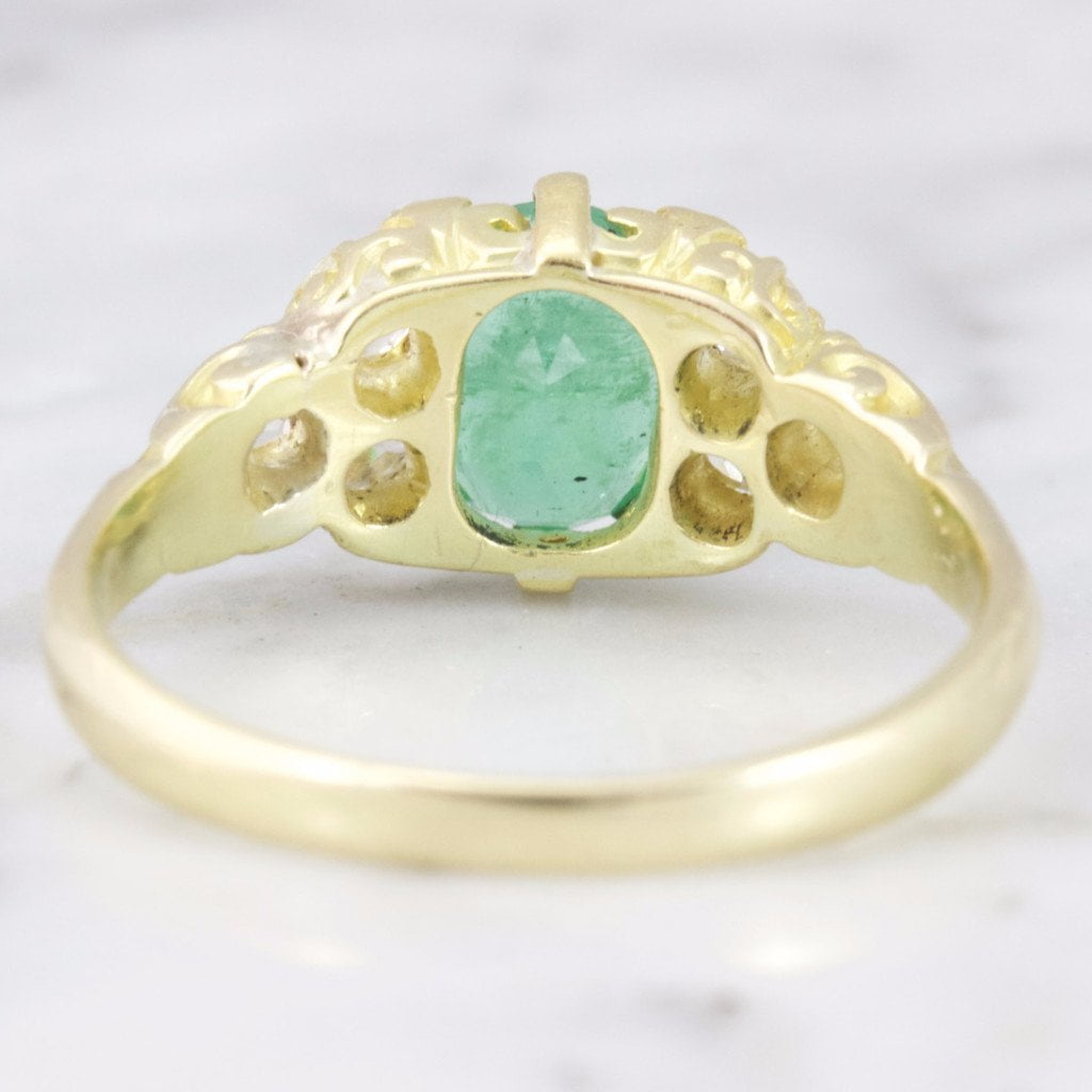 The Janelle ring is a Vintage engagement ring with a 0.93 carat green emerald set in a 6 prong creamy yellow gold setting. The emerald is adorned on the sides by six diamonds totaling 0.30 carats. The sides have scrolling engravings along the side that move into a smooth band. An inscription on the inner shank reads "4/10/55." This ring is currently a size 6.75 and can be resized.