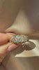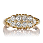 Two rows of antique diamonds create a beautiful navette-like shape across this finger in this historic beauty. The lacy gold setting adds detail to the ten old cut diamonds. The Sinclair ring lays beautifully on the finger and can be worn alone or stacked with other diamond or gold bands for a styled look.