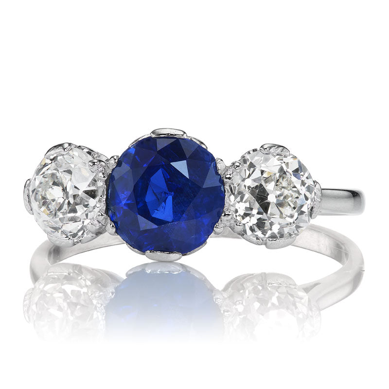 The Shyla ring is an authentic vintage sapphire and diamond ring from the Art Deco era circa 1930. The ring centers a GCS-certified 2.04-carat No-Heat Burma Sapphire. An Old European Cut diamond is set on either side, totaling approximately 1.40 carats of approximately J-K color, VS-SI clarity. The stones are set in a platinum setting with Fleur-de-Lys style prongs. The ring is currently size 7.75 and can be resized!
