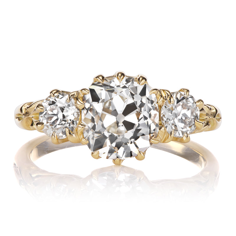 The Leander 2.28 ring is an AB original design made right here in NYC. The ring centers a GIA-certified 2.28-carat Old Mine Cut diamond of J color, VS1 clarity. On either side of the center stone is an Old Mine Cut diamond, together combining for approximately 0.71 carats. The stones are set in our signature 18kt yellow gold. The ring is currently size 6.75 and can be resized!