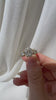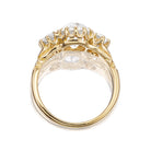 The most lovely elongated Old Mine Cut centers this gorgeous, whimsical ring. Vintage-inspired engraved shoulders frame coordinating side stones, making this ring a cohesive and artfully designed piece. We love this play on the three-stone ring that gives beautiful finger coverage and a bright, beautiful and romantic look.