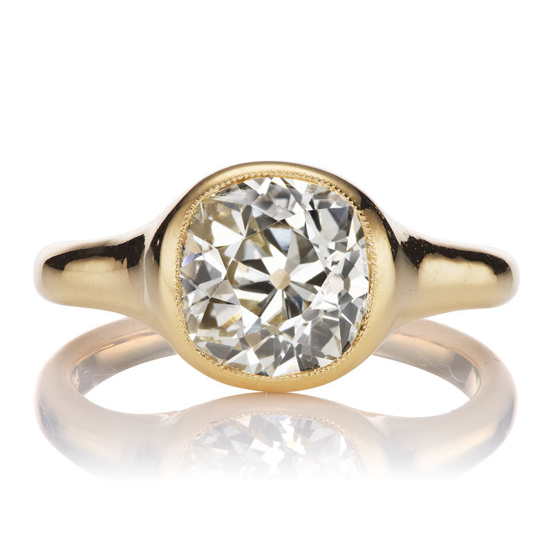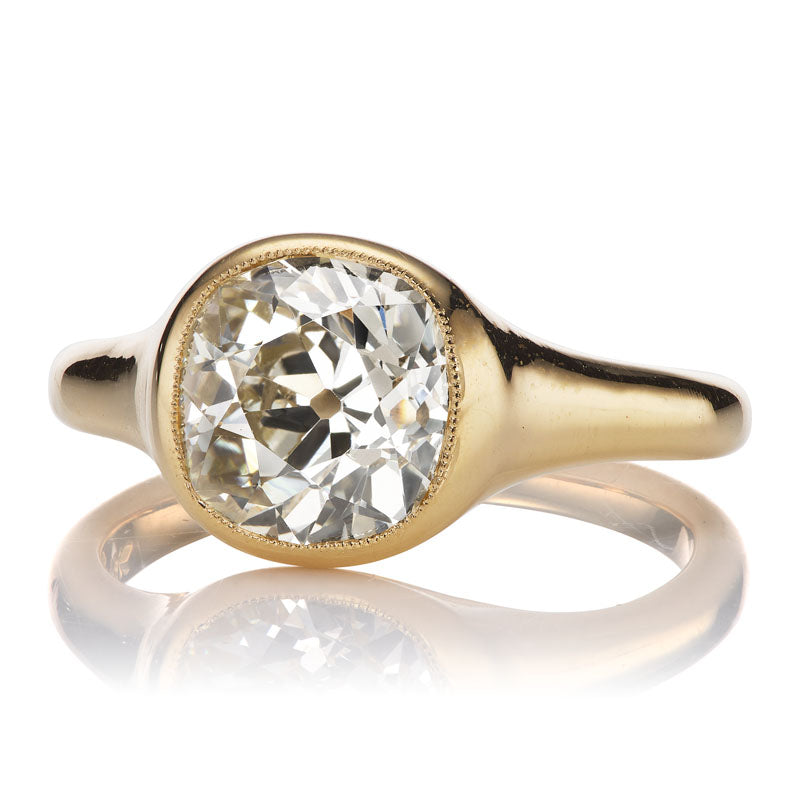 The Georgie 2.15 ring is an AB original design made right here in NYC. The ring centers a GIA-certified 2.15-carat Old European Cut diamond of N color, VS2 clarity. The stone is bezel-set in an 18kt yellow gold setting. The ring is currently size 5.75 and can be resized!
