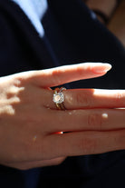 The Nina ring is an AB ring centering a GIA-certified 2.07 carat Old Mine Cut diamond of G color, SI1 clarity. The diamond is set in a four-prong Platinum setting with two additional carré cut diamonds set into the basket. The ring is currently size 5.75 and can be resized!