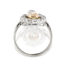 An exceptional, authentic antique. Intricate details—from the softly swooping band to the floating halo—give the ring its distinctive presence. It sits notably low on the finger while still taking up generous real estate. The rose-gold setting around the center stone adds a subtle warmth against the platinum mount, lending a soft rosiness to an already stunning piece.
