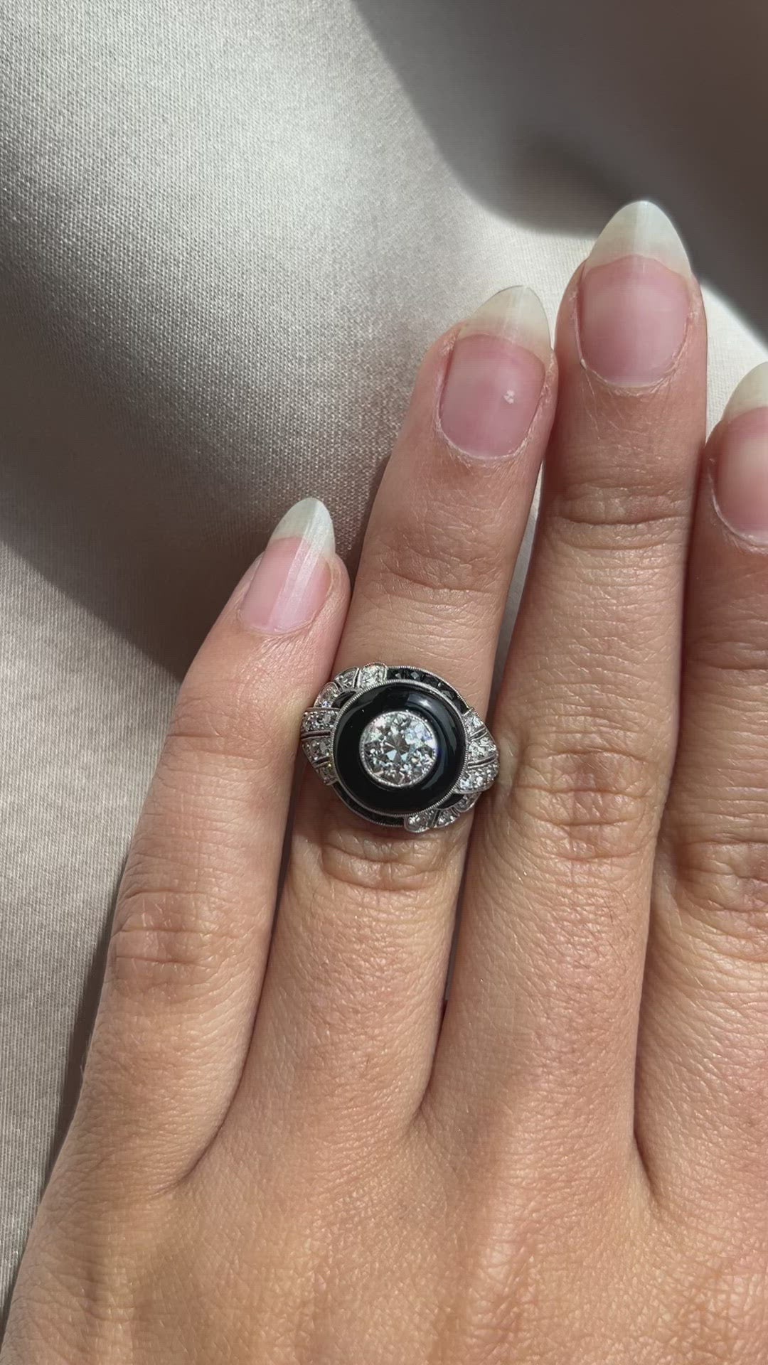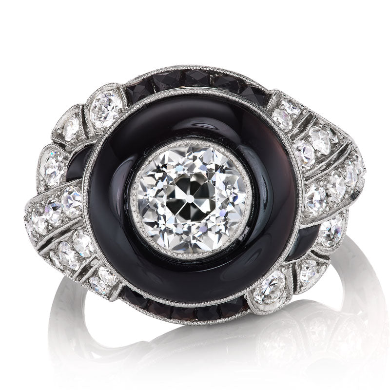 The Treviso ring is an authentic vintage diamond ring from the Art Deco Era circa 1920. The ring centers a GIA-certified 1.13-carat old European cut diamond of J color, SI1 clarity. The stone is bezel set in a platinum setting with a gorgeous black enamel halo surrounding the center stone. Ten French-cut onyx baguettes and 22 old cut diamonds are set throughout the setting of the ring to give a bold contrast of colors. The ring is currently size 4.5 and can be resized!