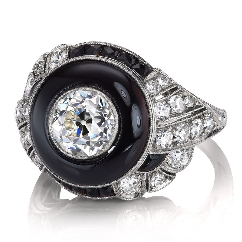 Such a statement piece. Bright white diamonds are intricately laid out amidst chic onyx accents for a breathtaking Art Deco piece.