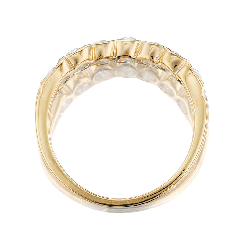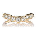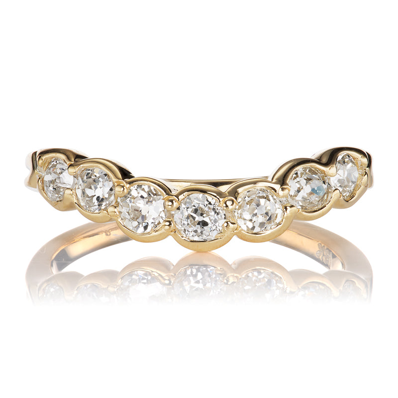 The Curved Allure 0.71 ring is an AB original design. The ring features 7 Old Mine Cut diamonds totaling 0.71 carats. The diamonds are of L-M-N color, VS-SI clarity. The stones are set in an 18kt Gold half-bezel setting. The ring is currently size 6.25+ and can be resized!