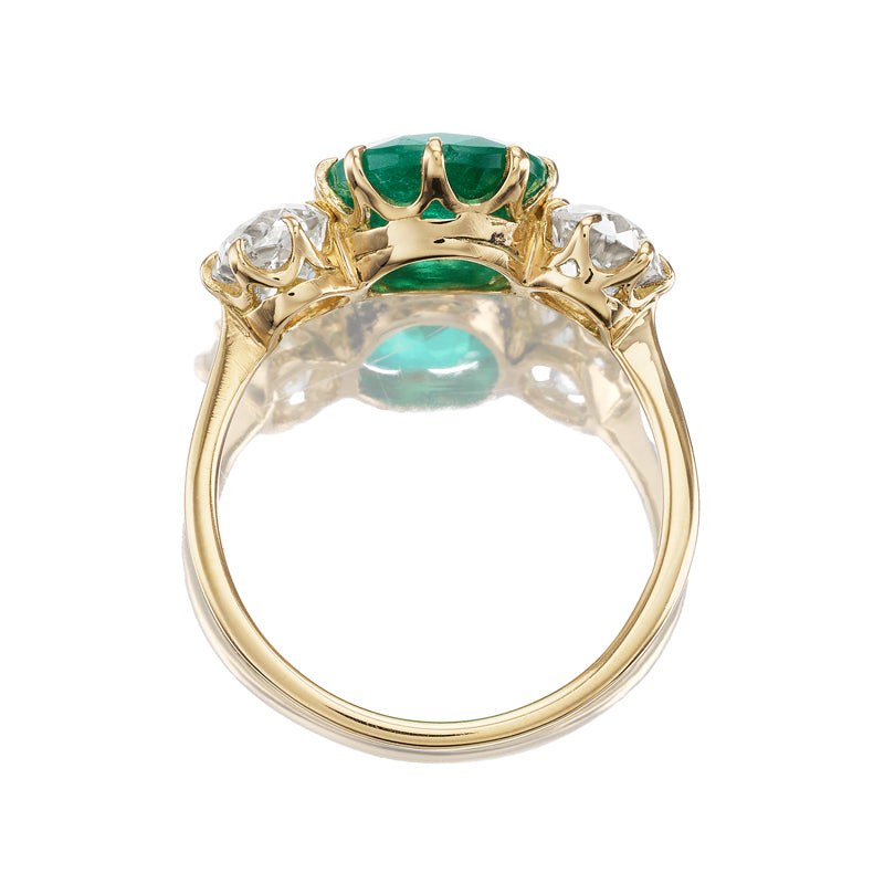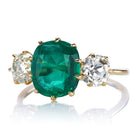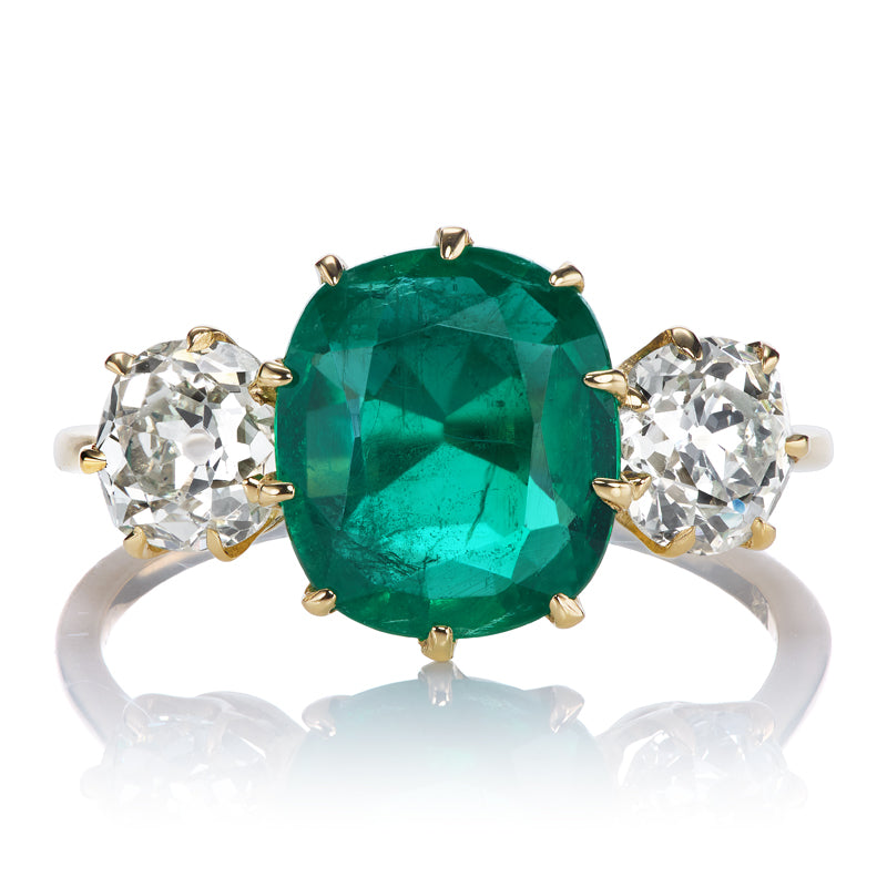 The Mallory 2.36 ring is an AB original design made right here in NYC. The ring centers a C Dunaigre certified 2.36 carat Cushion Cut Zambian Emerald with minor clarity enhancement. To each side of the Emerald is an Old Mine Cut diamond of approximately K-L-M color, SI clarity that combine for a total of 1.36 carats. The stones are prong set in our signature 18kt Yellow Gold setting. The ring is currently size 6.5 and can be resized!