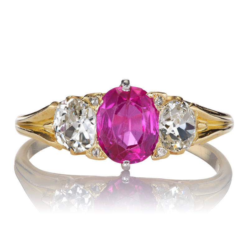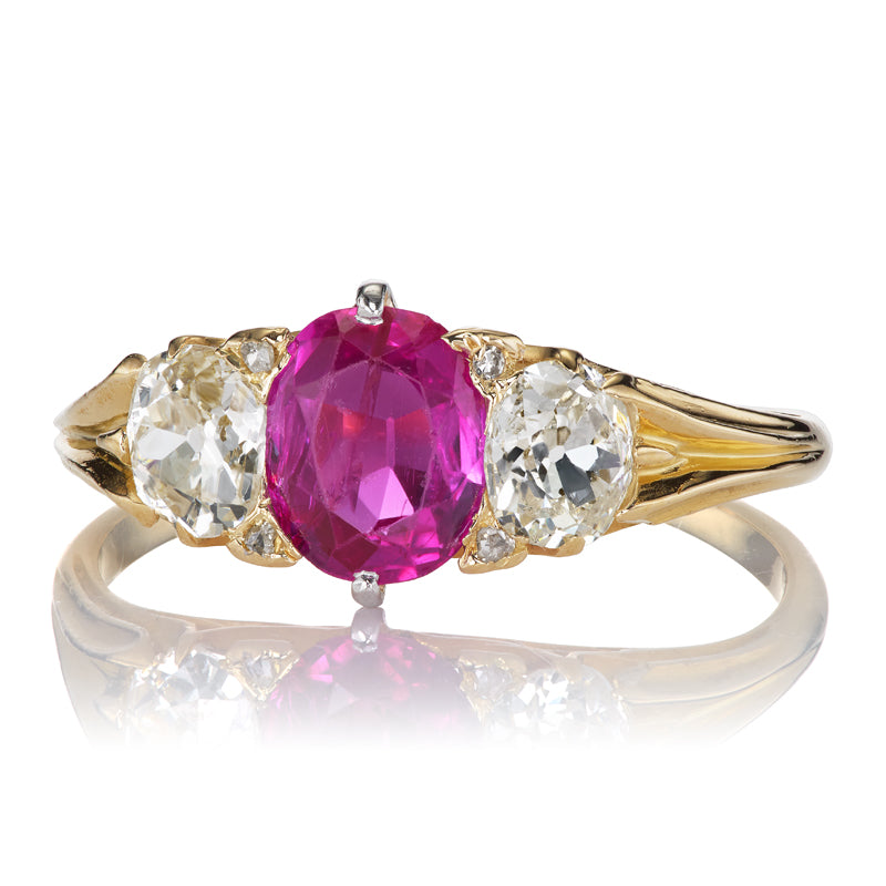 The Bronwyn ring is an authentic vintage diamond ring from the Victorian Era circa 1890. The ring centers a GIA-certified Burma No Heat Oval Cut Purplish Red ruby of approximately 1.00. On either side of the center stone is an Old Mine Cut diamond as well as 4 tiny Rose Cut diamonds, all of approximately J-K color, all together totaling 0.65 carats. The stones are set in an 18kt yellow gold setting. The ring is currently size 8.5+ and can be resized!