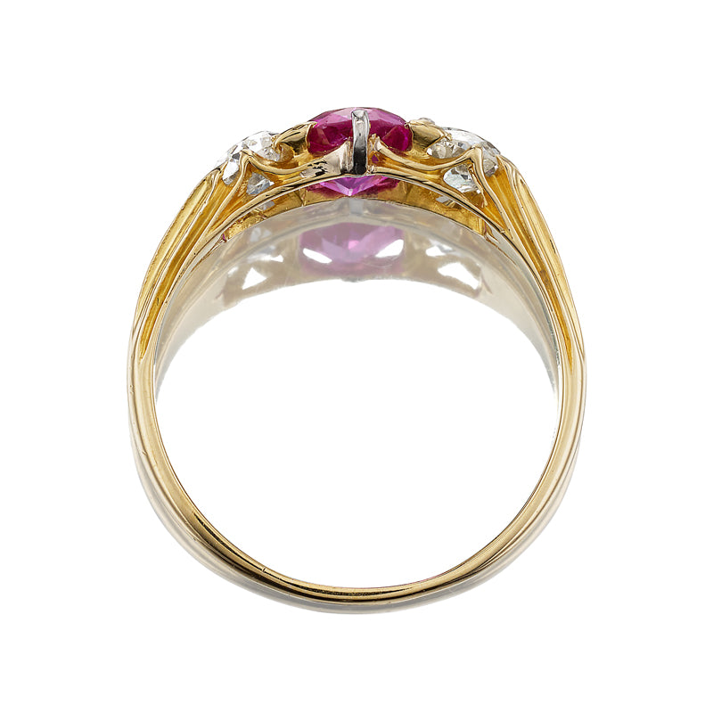 We love the variety of red and pink shades we find in rubies, and this fuchsia-toned find is such a delight. The bright side diamonds and ridged gold band only add to the charm of this fabulous antique piece.