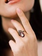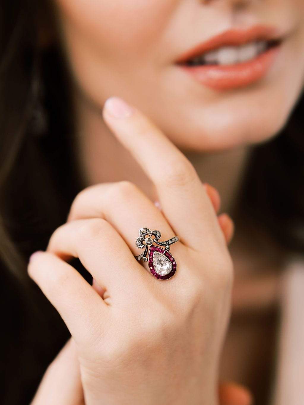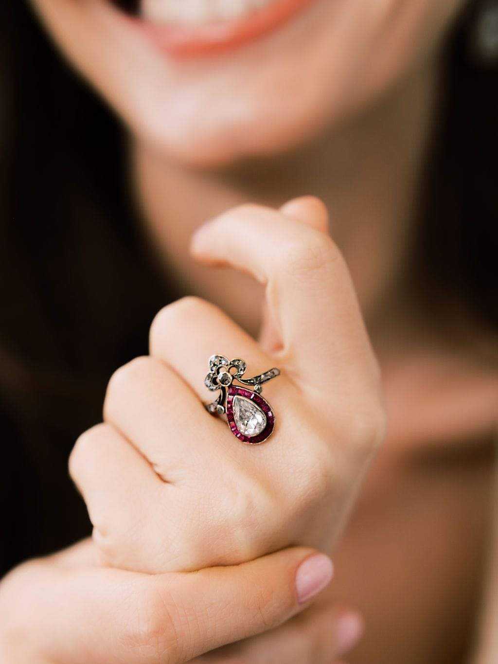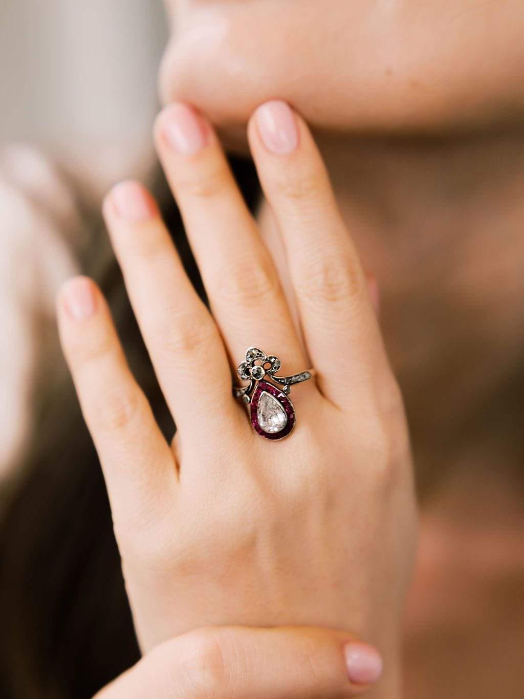 Such an incredible authentic antique piece. The ring sits so low to the finger and takes up major real estate. The rubies add a very welcome vibrant pop of color!