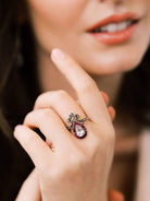 The Crown ring is a vintage diamond engagement ring. The ring centers a Pear rose cut diamond of approximately 1.50 carats J-K color, I1 clarity. The stone is set in a closed-back silver and 14 karat yellow gold setting. Surrounding the diamond is a halo of 20 channel-set calibré cut rubies. Twenty rose cut diamonds are bead-set into the setting. The ring is currently size 8.5 and can be resized!