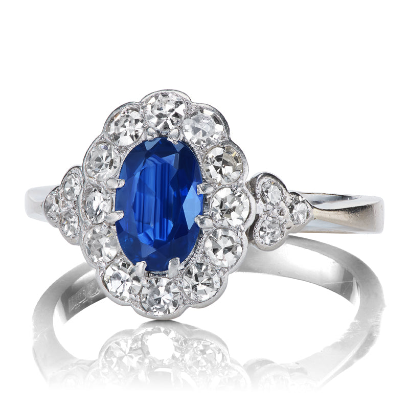 A rich, ocean-blue sapphire sits at the center of this Art Deco Era treasure. A classic sapphire cluster this piece is a romantic and timeless choice as an engagement ring or makes for a beautiful gemstone addition to your fine jewelry collection.