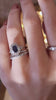 The Aimee ring is an authentic vintage diamond ring from the Art Deco Era circa 1930. The ring centers a GIA-certified Oval Cut Heated Thai Sapphire. A halo of 12 single cut diamonds surrounds the Sapphire center stone with three additional small diamonds set on each shoulder of the ring. The stones are set in a platinum setting with an 18kt white gold band. The ring is currently size 5.5 and can be resized!