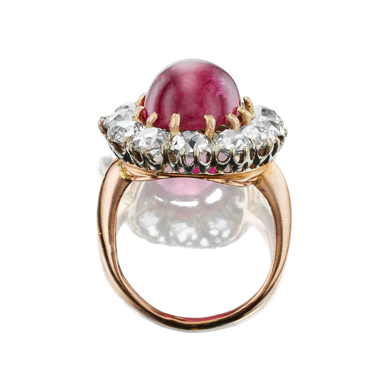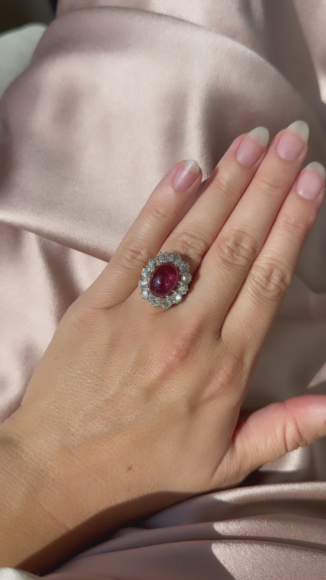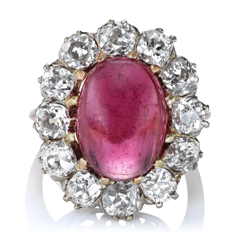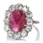 The Melanie ring is an authentic vintage tourmaline and diamond ring from the Edwardian Era circa 1910. The ring centers a GIA-certified Purplish Pink Cabochon Cut Tourmaline weighing approximately 6-carats. A halo of 12 old mine cut diamonds surround the center stone combining for approximately 2.40-carats of approximately J-K in color, VS-SI clarity. The stone is set in a beautiful 14kt white and yellow gold setting. The ring is currently size 6.25 and can be resized!