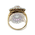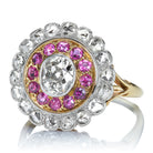 This playful cluster ring features a fun mix of color with rubies, diamonds, platinum, and yellow gold for an especially eye-catching piece. A floral halo gives this beautiful antique a feminine and sweet feel that appeals to our romantic side.