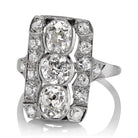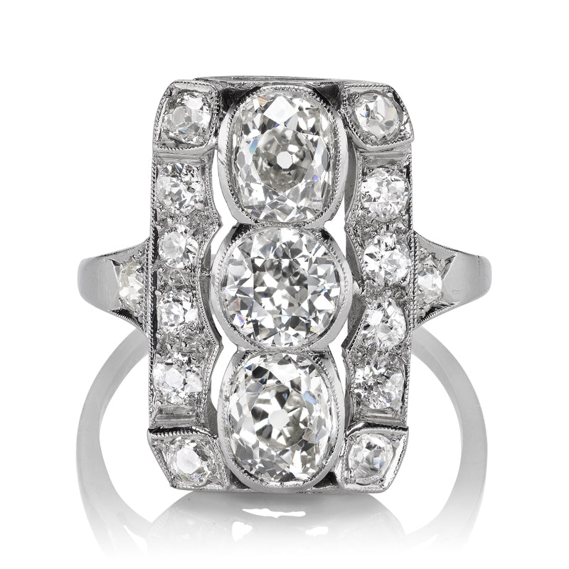 The Alicia ring is an authentic antique ring from the Art Deco era, circa 1920. The ring centers an approximately 1-carat Old European Cut diamond of I-J color, VS clarity. Two Old Mine Cut diamonds are set above and below the center stone, each of approximately 1.00-carat, K-L color, VS-SI clarity. The three large stones are bezel-set in Platinum. 14 smaller Old European Cut diamonds are set into the Platinum shield-style setting and onto the band. All of diamonds combine for approximately 4.20 carats in total weight. The ring is currently size 8 and can be resized!