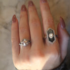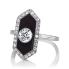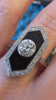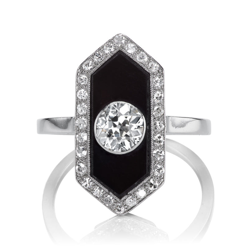 This striking shield-shaped piece from the Art Deco period contrasts slick onyx with a bright, brilliant transitional cut diamond. With ample finger coverage, Beatrice embodies the bold spirit of the Roaring 20s. We love her as a non-traditional engagement ring or as a cocktail ring!