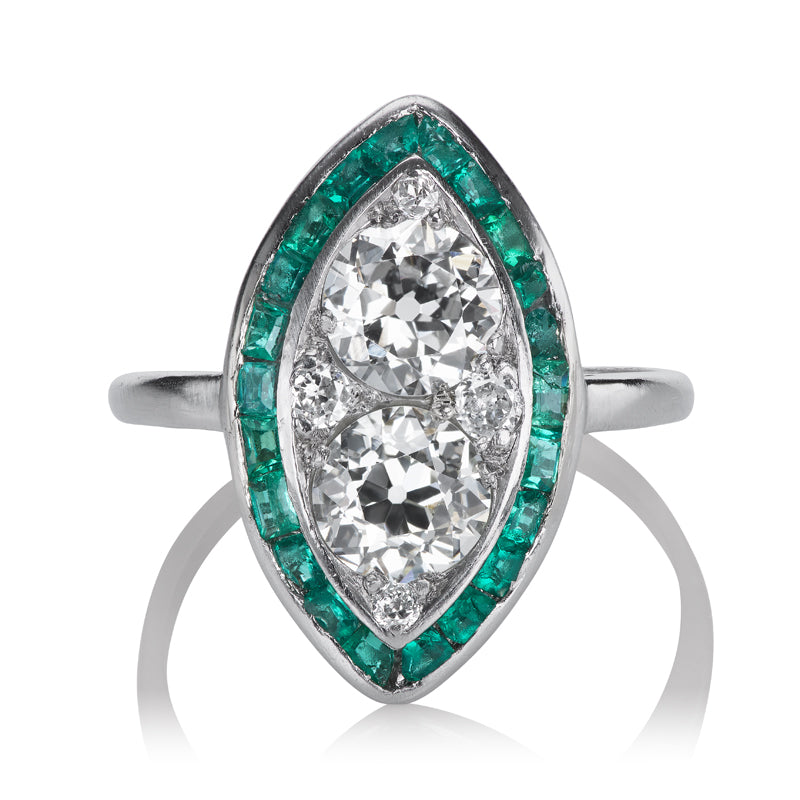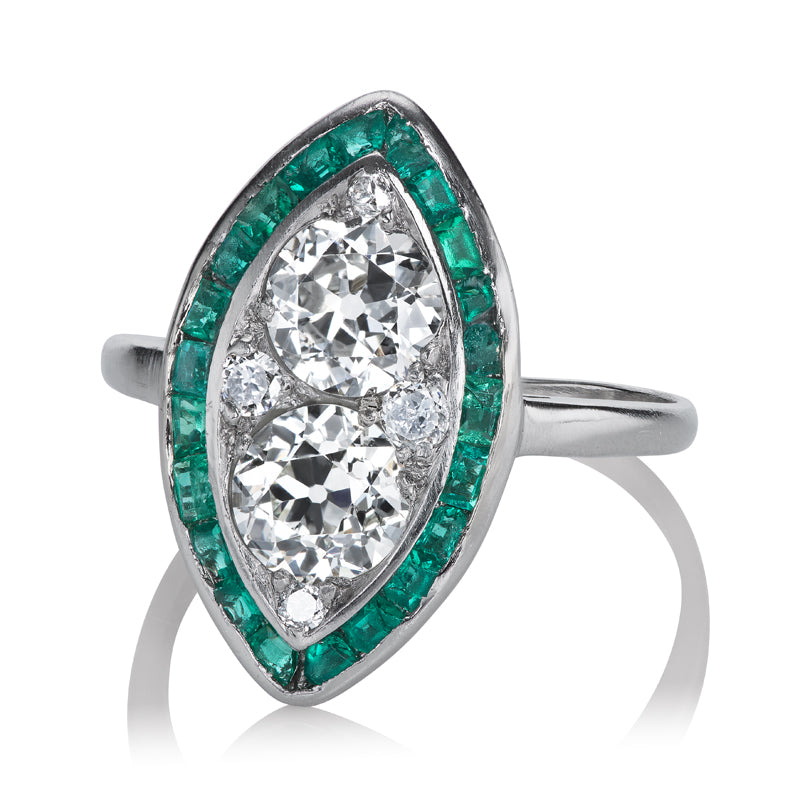 The Sonam ring is an authentic vintage diamond ring from the Art Deco Era circa 1920. The marquise shaped ring centers two Old European Cut Diamonds of G-H color, SI-I clarity, weighing approximately 0.65 carats each. Four additional Old Cut diamonds are set around the two center stones combining for an approximate total of 0.12 carats. Twenty-two Calibre Cut Emeralds are set to create an outline around the face of the ring. The stones are all set in a Platinum setting. The ring is currently size 5.75 and can be resized!