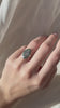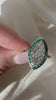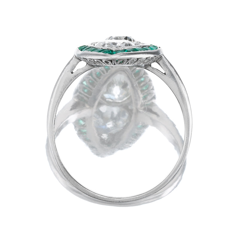 What vintage dreams are made of! A low profile piece featuring two gorgeous white old European cut diamonds with classic faceting center a creative design made to look like a Marquise with a chic emerald outline. It's almost like a hidden Toi et Moi within a classic silhouette. The profile is incredible low for an easy, close to the finger wear.