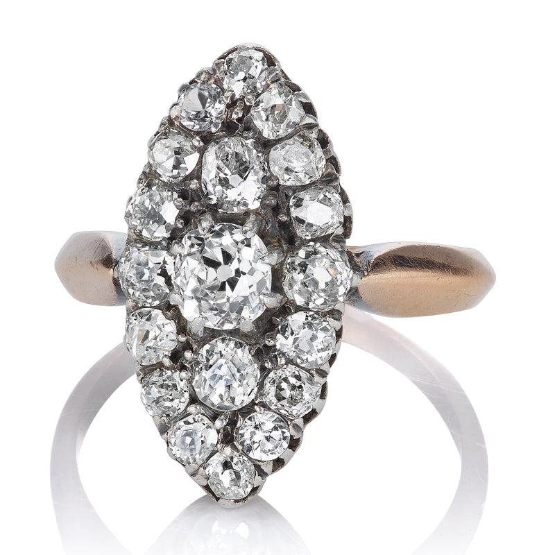 The Atlee ring is an authentic vintage French diamond navette ring from the Victorian Era circa 1870. The ring features an Old Mine Cut diamond surrounded by 18 additional old mine cut diamonds set in a Navette shape. The stones are set in a handmade 18kt rose gold and silver setting with the most beautiful patina on the face of the ring. The stones all grade approximately J-K in color, VS-SI in clarity and combine for roughly 1.40-carats. The ring is currently size 5.75 and can be resized!