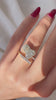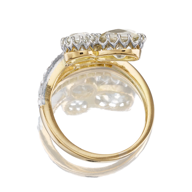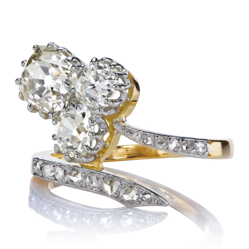 Peggy is such a unique and vibrant piece. Featuring 3 white and bright diamonds that shine in this eye-catching two-tone setting. An antique work of art with such an innovative and delicate layout. And hey, with a statement piece such as this, what you see is up to you ;)
