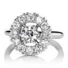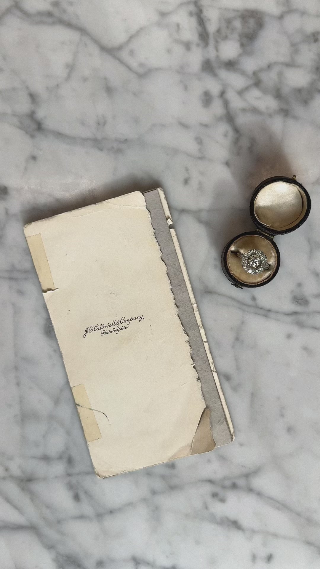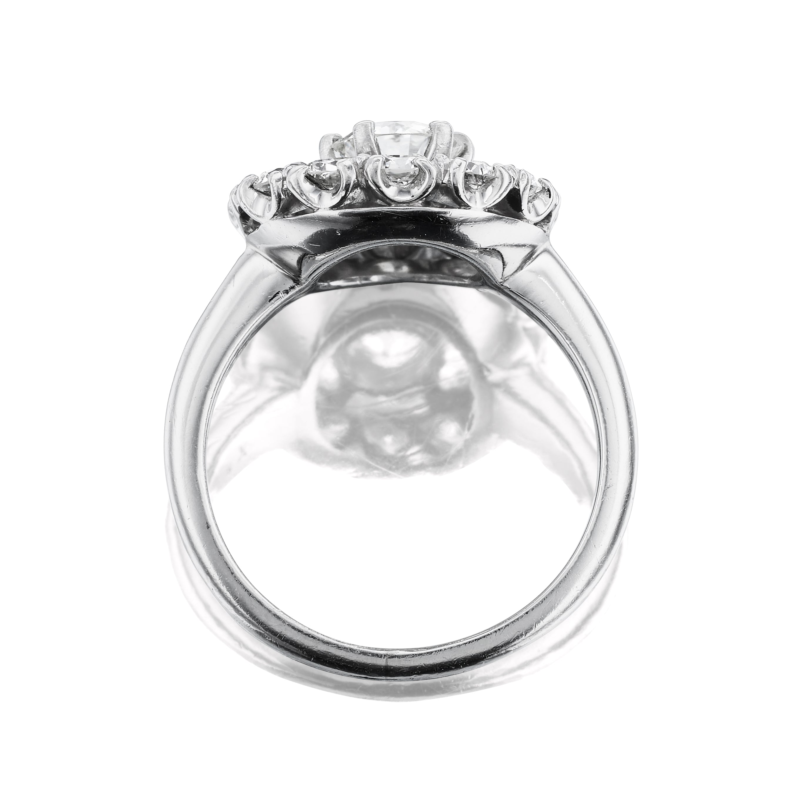The Dolores ring is an authentic vintage J.E. Caldwell diamond cluster ring circa 1961. The ring centers a GIA-certified 0.69 carat Transitional Cut diamond of J color, SI1 clarity. Surrounding the center stone is a halo of 12 Old European Cut and Transitional Cut diamonds combining for approximately 0.85 carats of I-J color, VS-SI clarity. The stones are set in a Platinum prong setting. The ring is currently size 5.25 and can be resized!